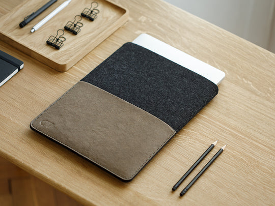 The simple sleeve includes an outside pocket made from washpapa, ideal for storing documents, cables, or earphones.