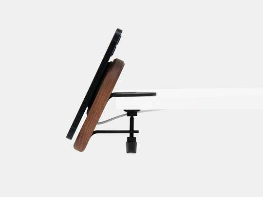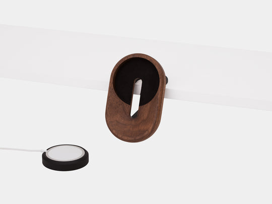 MagSafe iPhone Desk Shelf Mount można przymocować do dowolnej półki lub blatu o grubości 12-30 mm (0,47''-1,18''). Należy umieścić ładowarkę MagSafe (nie ma jej w zestawie) w metalowym uchwycie – będzie ona stabilnie trzymać iPhone’a w pozycji pionowej. Możesz również zastąpić ładowarkę Apple naszym MagSafe Puckiem, jeśli chcesz używać Desk Shelf Mount tylko do przechowywania iPhone’a.