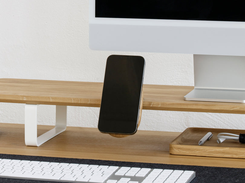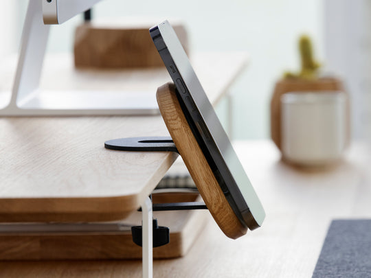 MagSafe iPhone Desk Shelf Holder to multifunkcjonalny uchwyt na iPhone'a, dzięki któremu skutecznie zoptymalizujesz przestrzeń wykorzystywaną do pracy. Przymocuj uchwyt do półki na biurku i wygodnie korzystaj z telefonu podczas wideokonferencji lub rozmów, nie ryzykując rozładowania baterii.