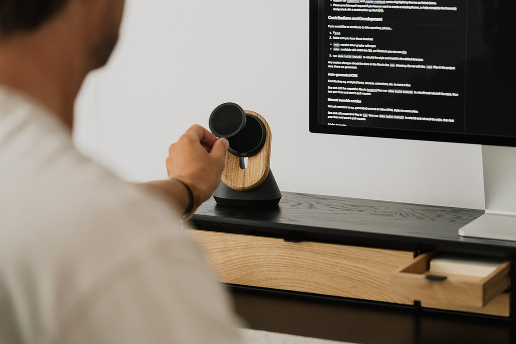 As for favorite products, I'm not objective on this issue, because I like every single one of our products. The Desk Shelf and MagSafe holders are a big help for me. I use the MagSafe Desk Shelf Mount with charger and the MagSafe iPhone Stand in the form of a magnetic stand together with the Puck. I also have some Catchall Trays and OakyBlocks to keep my desk organized.